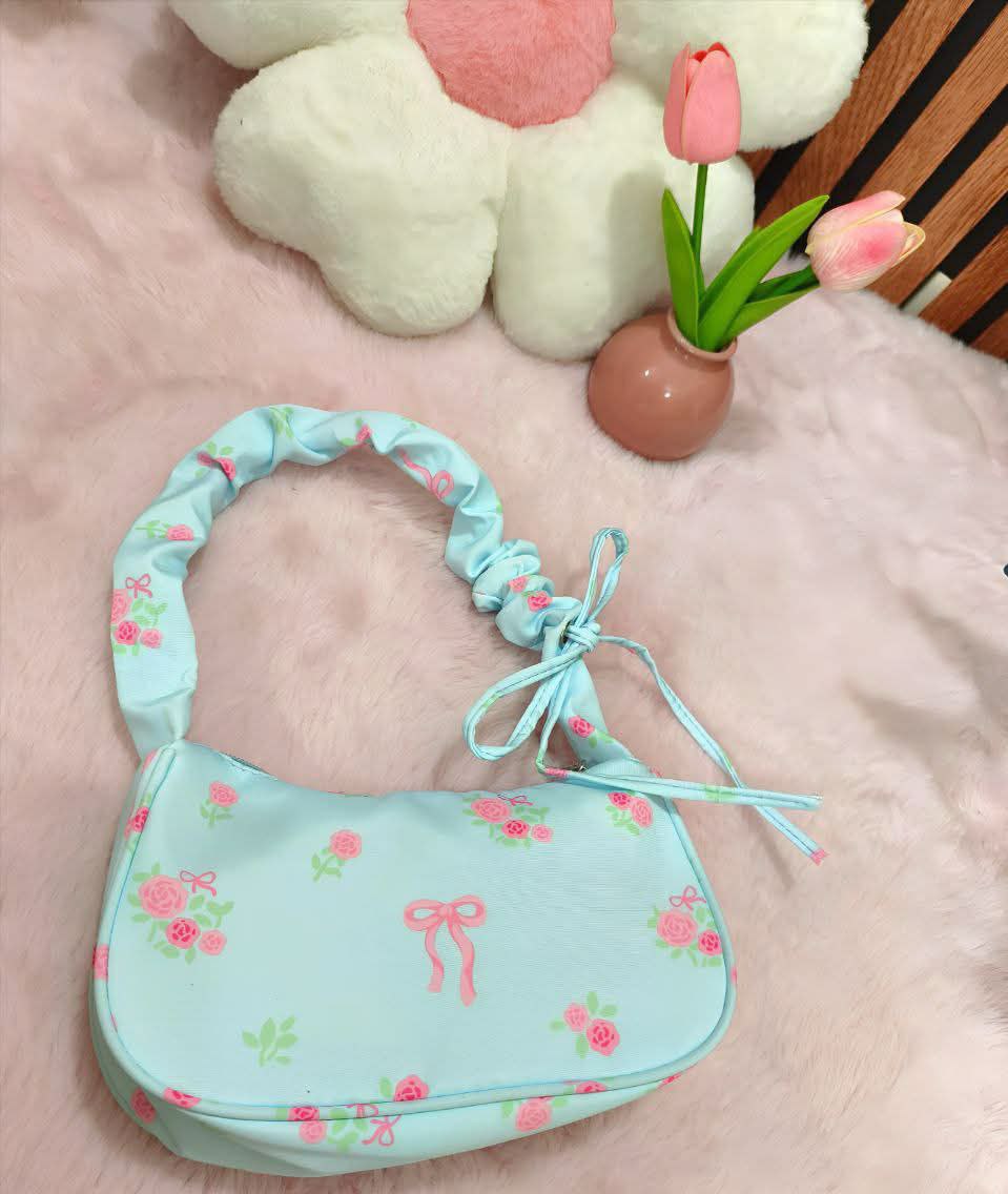 đĨđThis is a small, floral-print shoulder or underarm bag with a ruched, soft handle and a bow detail at the front. The bags are available in blue, black, white, and pink color options. They feature a zipper closure and are often made from nylon or polyester fiber.đĢđ